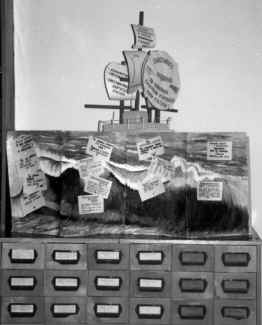 Фото 22-й блок. • Ты можешь решить эти проблемы сам! Обратись к каталогам и картотекам. • Алфавитный каталог (АК): – включает сведения о каждой библиотечной книге; – все карточки со сведениями о книгах расположены в строгом алфавите авторов и заглавий; – АК ответит тебе, есть ли конкретная книга в библиотеке. Для этого ты должен знать лишь автора и название книги. • Систематический каталог (СК) поможет тебе подобрать литературу по нужной теме. Все карточки со сведениями о книгах расположены по темам (см. на разделители). Если не знаешь, как найти литературу по теме, смотри алфавитно-предметный указатель в каталожном ящике № 12. Более оперативно узнать нужный раздел ты можешь, повернув штурвал корабля. Если испытываешь затруднение – обратись к библиотекарю. • Систематическая картотека статей (СКС) – твой надежный помощник при поиске статей из газет, журналов, сборников. Статьи расположены за разделителями по темам. Правила пользования СКС те же, что и для СК. 3-й блок. • Это каталожная карточка. Она содержит полные сведения о книге или статье. Далее расположены образцы карточек для алфавитного и систематического каталогов, систематической картотеки статей. 4-й блок. • Схема работы с каталогами: – Четко сформулируй свой запрос. – Открой нужный каталожный ящик. – Найди раздел. – Внимательно просмотри карточки (не вытаскивая и не переставляя). – Выпиши заинтересовавшие тебя книги, статьи на листках заказов или в блокнот. – Обратись с заказом к библиотекарю. • Помни, успешная работа с каталогами обеспечена, если ты освоишь правила пользования ими. Счастливых поисков, интересных и неожиданных находок и открытий тебе, читатель! Гордо возвышающийся корабль с именем «Надежда» помогает ориентироваться в каталогах, картотеках и в книжном фонде. Поворот рулевого колеса – и перед читателем нужный раздел. Каждому книжному разделу соответствует нужный рисунок. Этот кораблик построен по идее авторов журнала «Библиография» (Сулина Ю.М. Информационная среда в детской библиотеке/Сулина Ю.М., Кузнецова В.К.//Библиография. – 1993. – № 5. – С. 24–32). В основу положен принцип действия вечного календаря, представляющий лоции для поиска информации в СБА и книжном фонде (фото 3).
