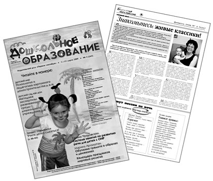 Выписывайте газету «Дошкольное образование» Издательского дома «Первое сентября». В ней вы найдёте несколько постоянных рубрик, напрямую связанных с нашим сегодняшним разговором. Для начала: на обложке непременно стихотворение – таков стиль «Дошкольного образования» (у нас в «БШ» – «Мысль в подарок», а тут – стих).