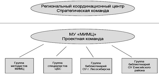 На уровне края координирующим и контролирующим центром данного конкурса и этого проекта стал региональный координационный центр (РКЦ), а в нём – стратегическая команда организаторов. В городе на базе нашего центра была организована проектная команда, в которую входили четыре малые группы: группа методистов МИМЦ, группа специалистов ЦБС, группа библиотекарей ОУ г. Лесосибирска и группа библиотекарей ОУ Енисейского района. Таким образом, наша команда была представлена библиотекарями не только системы образования нашего города, но и соседнего района, а также библиотекарями из централизованной библиотечной системы, причём в команде работали и специалисты-библиотекари, и специалисты-методисты МИМЦ (рис. 1).