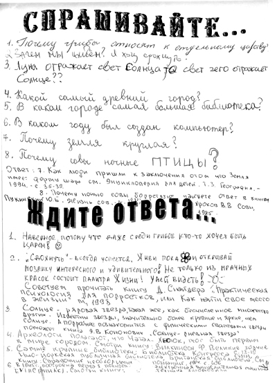При создании электронной базы данных периодических изданий мы встречаем в статьях много интересных и удивительных фактов из мира природы, науки и техники. Мозаику кратких сведений объединили по темам: “Изобретения XXI века”, “Известно ли вам, что…”, “Первые…”, “Посмотрите”, “Если вы думаете, что…”, “Оказывается…”, “Интересные факты о…”, “Такие разные книги” – и представили для любознательных читателей. А те из них, кто ищет ответ на интересующий вопрос, может задать его прямо на специальных листах “Спрашивайте… Ждите ответа”, которые имеются на стенде. “Почему муха жужжит?”, “В каких городах есть Диснейленды?”, “Почему совы ночные птицы?” и т.д. В течение одного-двух дней библиограф даёт ответ, рекомендуя книги для чтения.